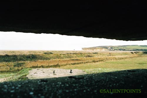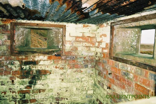 View from inside the heavy machine gun post. Note the remaining mounting bolts on the concrete outside the gun-slit.