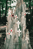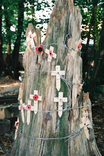 Crosses are placed on the remains of trees from the original wood.